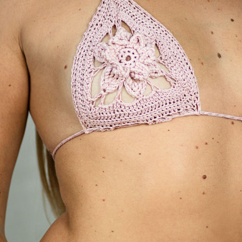 The Flora bikini top reimagines the classic triangle with lace-like crochet for a bold, elegant see-through effect.